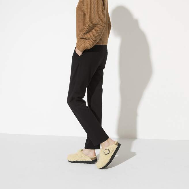 An evolution in the classic Boston clog. Here, Papillio presents the clog with a trendy platform sole. The bevel results in maximum walking comfort. This version features warm, genuine shearling padding in a Teddy style and a big, elegant pin buckle to round off this bold, but super cozy look. The upper is made from Teddy style genuine shearling with a microfiber lining.