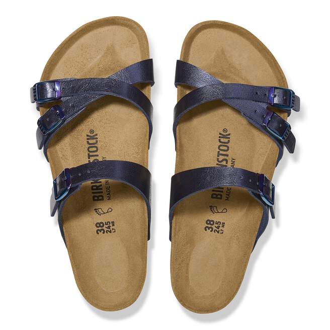 The BIRKENSTOCK Franca is a jaunty sandal with slim cross-over straps. The impressive combination of design and wearability will see fashion-conscious women through the day with elegance and comfort. Here, we see the sandal with a silky sheen finish. The color-coordinated details round off the shoe¡¯s look of sophistication. The upper is made from the skin-friendly, hard-wearing synthetic material Birko-Flor?.