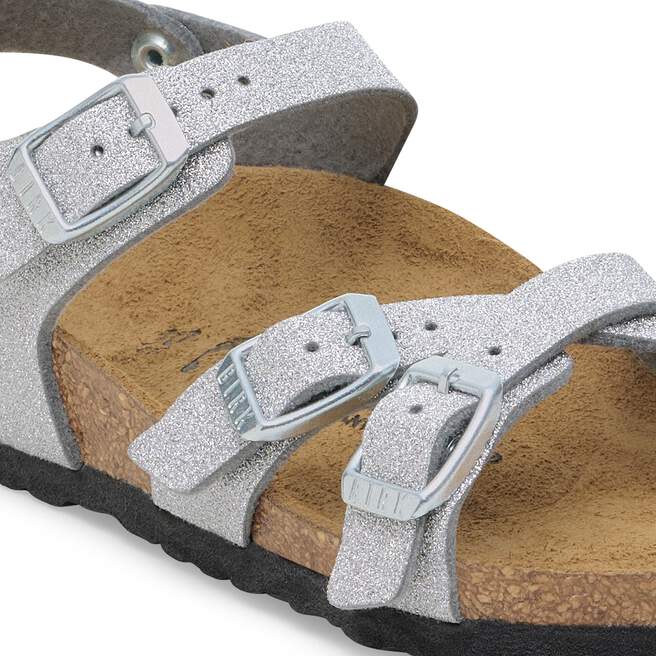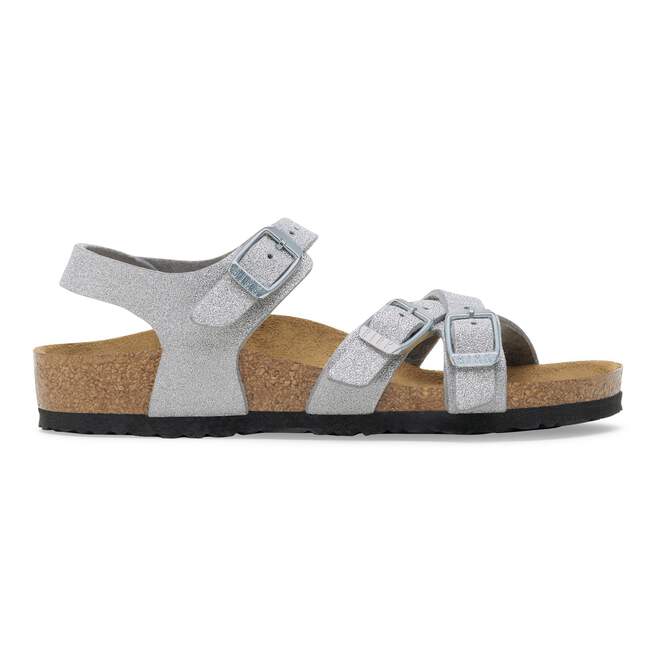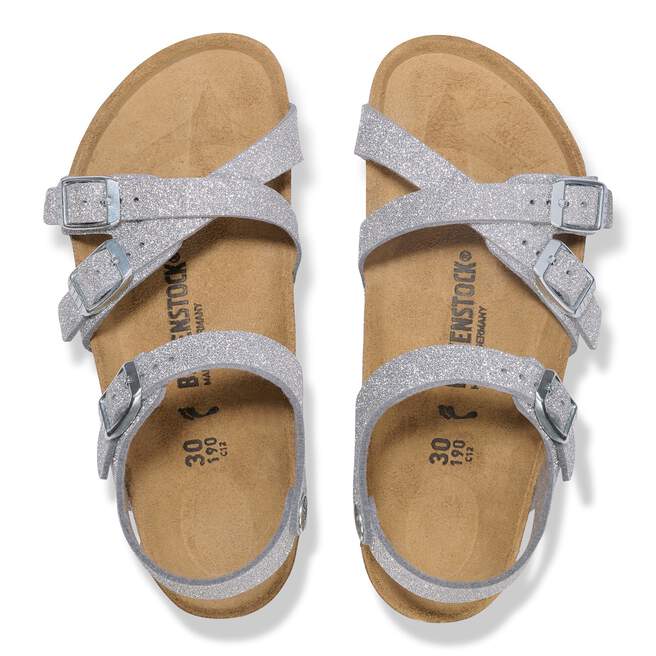 The BIRKENSTOCK Kumba is a pretty sandal featuring crossover straps and an ankle strap for a secure and comfortable grip. It¡¯s just the thing for hot summer days. This version is made from a synthetic material with a TPU coating that uses special otechnology to create a shiny glitter effect. This technology ensures that no glitter dust falls off.