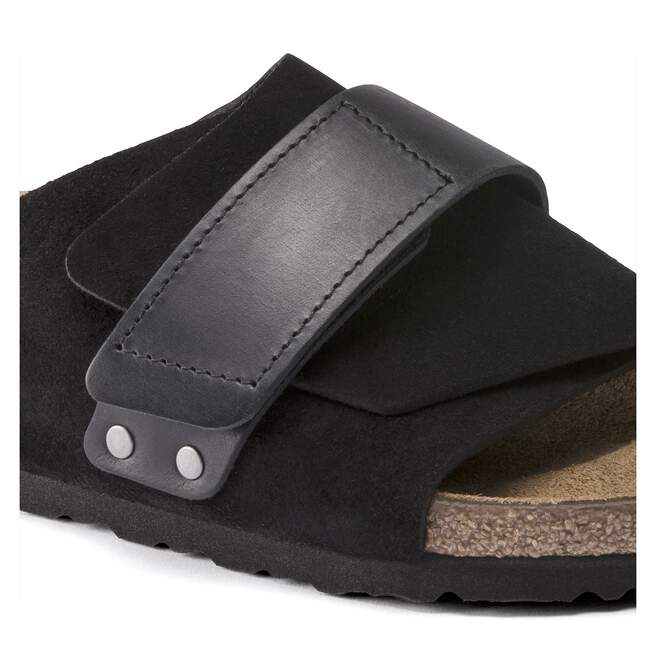 The BIRKENSTOCK Kyoto is reinterpreted from the classic Z¨¹rich model. The buckles have been replaced with a hook and loop closure for optimum fit. This version has an added update of mixed materials – with a soft suede upper and a sleek oiled leather strap.