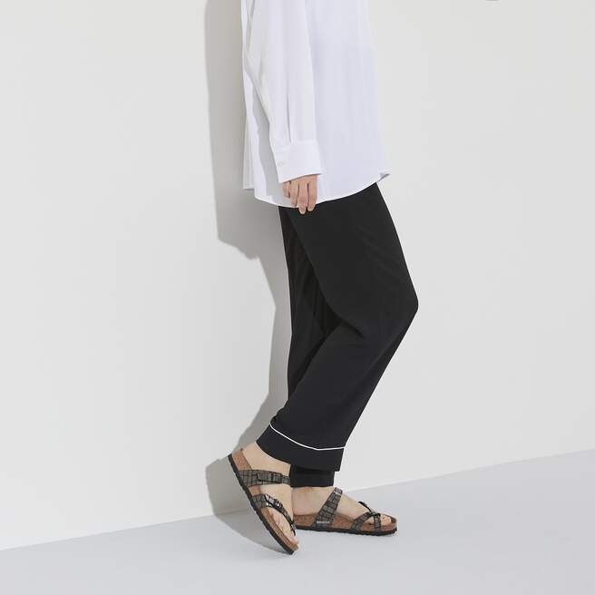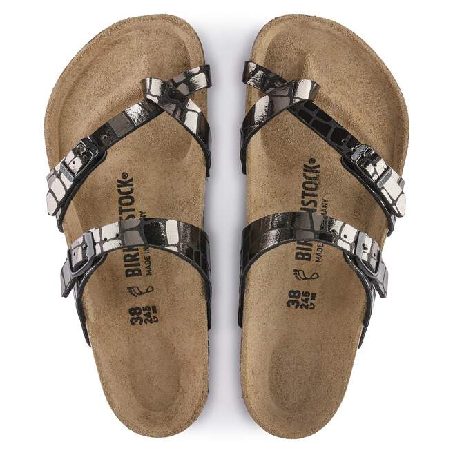 Elegantly comfortable with crisscrossing straps, the Mayari redefines the thong sandal with a single toe loop. This season, a gator-inspired pattern scales up the shine, transforming the classic style with just the right edge. Handcrafted for quality, no two patterns are alike to give you that one-of-a-kind feel. Complete with classic BIRKENSTOCK design elements, like adjustable buckle closures and a contoured cork-latex footbed for the ultimate in support.