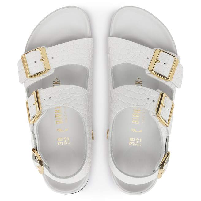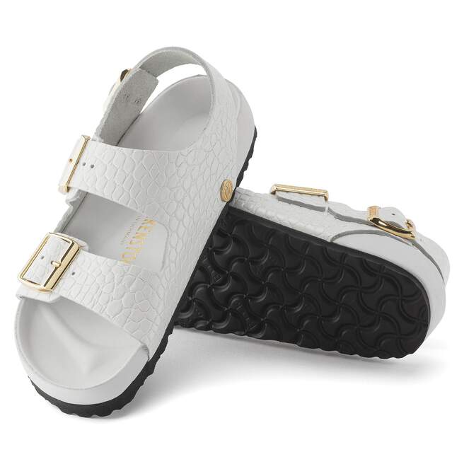 The BIRKENSTOCK Milano now features a reptile leather look and feel and a compact design with an ankle strap. The metal pin buckles are individually adjustable with color-coordinated detailing. The exquisite footbed is fully lined with soft piumato leather, making it exceptionally comfortable. The upper is made from embossed natural leather.
