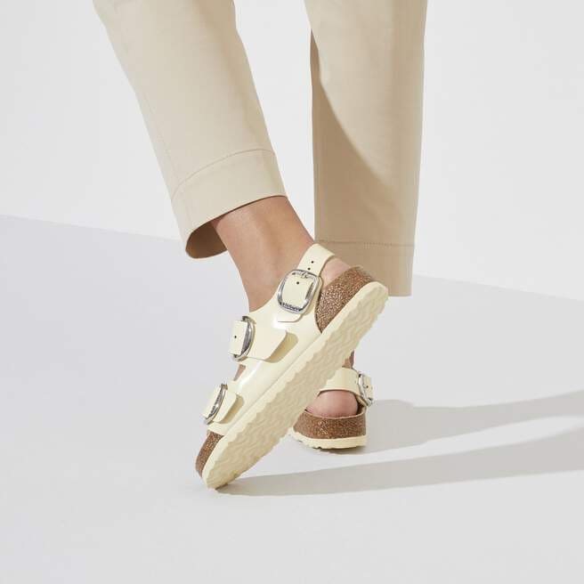 Maximum grip, stability, and a perfect fit! The BIRKENSTOCK Milano offers all of this thanks to its compact design with an ankle strap. The Big Buckle version features a large, elegant pin buckle. The semi-exquisite footbed is fully lined with soft piumato leather, making it exceptionally comfortable. The upper is made from high-quality natural leather with a shiny patent coating.