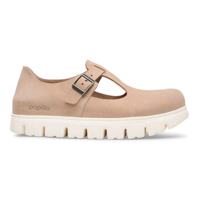 The BIRKENSTOCK Paris is a reinterpretation of the popular Mary Jane silhouette. This eye-catching shoe with a classic T-bar design combines timeless elegance with modern comfort. The striking T-strap gives the model a feminine yet modern look that is perfect for everyday wear. The buckle on the side allows the shoe to be adjusted for a perfect fit and ensures optimal support all day long. Here, Papillio presents the shoe with a stylish platform sole with extra deep tread lines. The bevels at the front and back provide for maximum walking comfort. The upper is made from especially soft suede which hugs the foot like a second skin.
