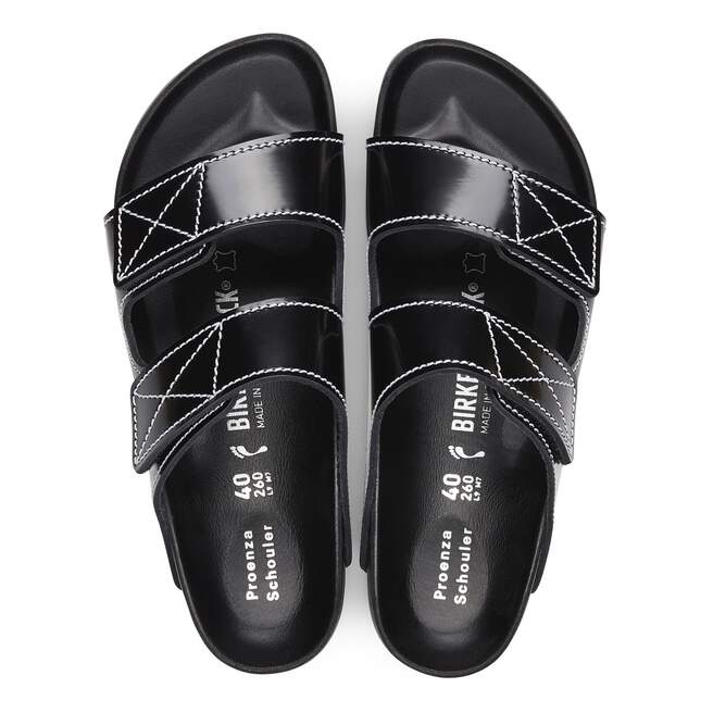 With minimal but striking details BIRKENSTOCK¡¯s iconic Arizona is injected with urbanism and luxe: high class leather contrasts with saddle stiches, while the cork sole is covered purely in smooth nappa leather offering an even more uniformed, uninterrupted look. To honor Proenza Schouler¡¯s love for the classic sneaker detail, for the first time ever BIRKENSTOCK introduces a hook&loop closure to replace the buckle.