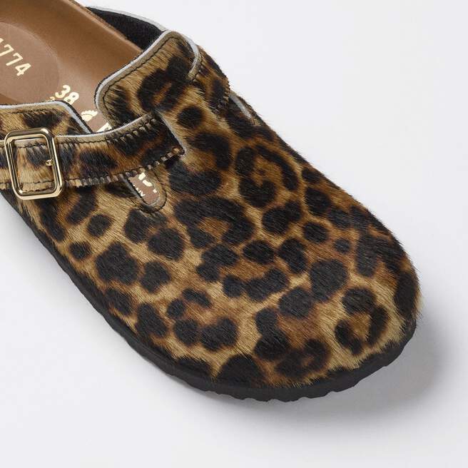 The Boston clog is reimagined with a pony- like fur upper for a premium look, enhancing the Boston¡¯s classic silhouette. Available in 2 colourways, leopard print and black, each pair features an exclusive 1774 buckle. Crafted with BIRKENSTOCK¡¯s signature footbed and covered with premium, tonal nappa leather, these clogs echoe the elegance and expressive spirit of 1920s Berlin.