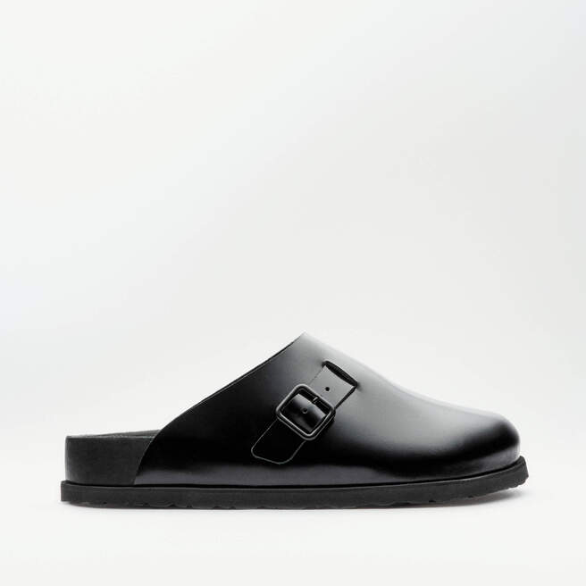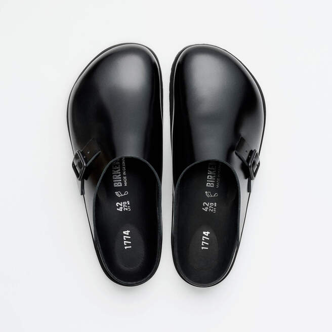 The 33 Dougal is a new silhouette created for this 1774 Collection. This new style takes its inspiration from the timeless BIRKENSTOCK Boston clog design while maintaining optimal orthopaedic support and adjustability. It boasts smooth leather with a high-shine finish and a color-matched buckle in autumnal hues: black and green moss.