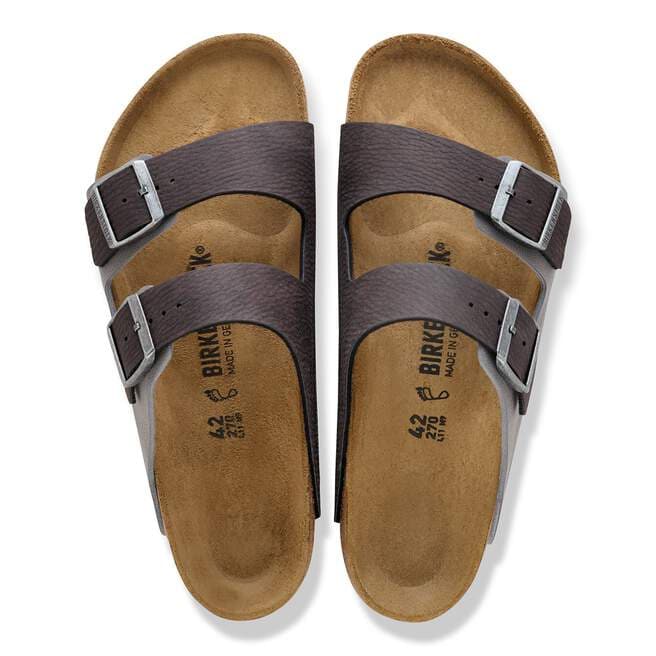 The BIRKENSTOCK Arizona is a genuine classic that has been delighting both men and women for decades. This simple sandal with two straps stands for timeless design and has long held cult status thanks to its comfort factor. The sophisticated Birko-Flor? synthetic material gives the sandal straps a matte finish reminiscent of natural leather grain, yet they are 100% vegan. The upper is made from smooth microfiber with a velvety feel.