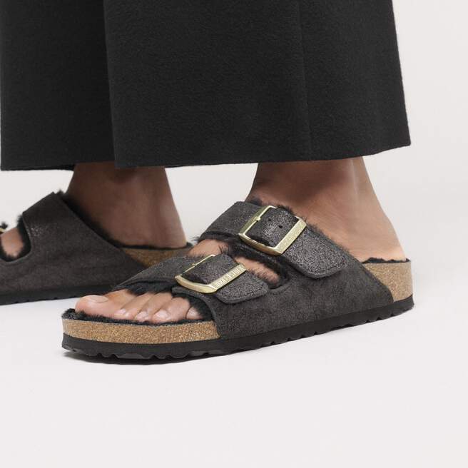 The Arizona sandal made cozy for the colder months. Softly lined in genuine shearling, with shimmery suede that softly catches the light. Designed on an original contoured footbed for a comfortable landing every time.