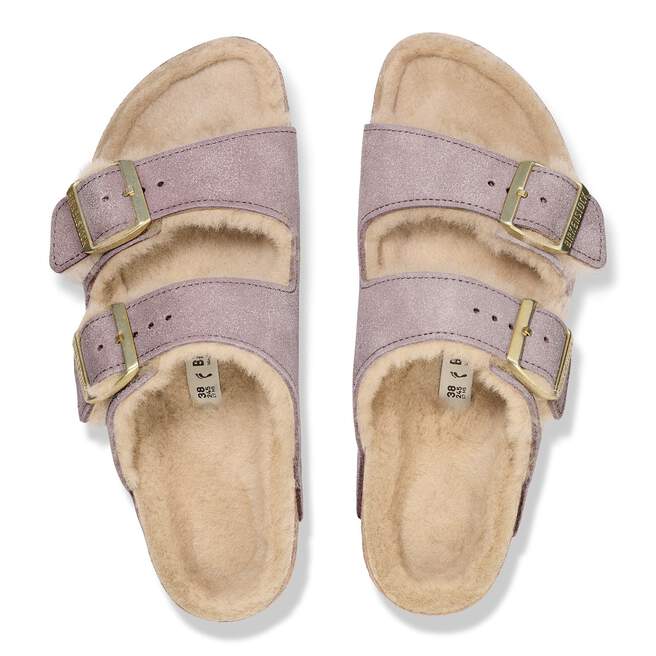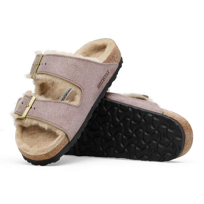 The Arizona sandal made cozy for the colder months. Softly lined in genuine shearling, with shimmery suede that softly catches the light. Designed on an original contoured footbed for a comfortable landing every time.