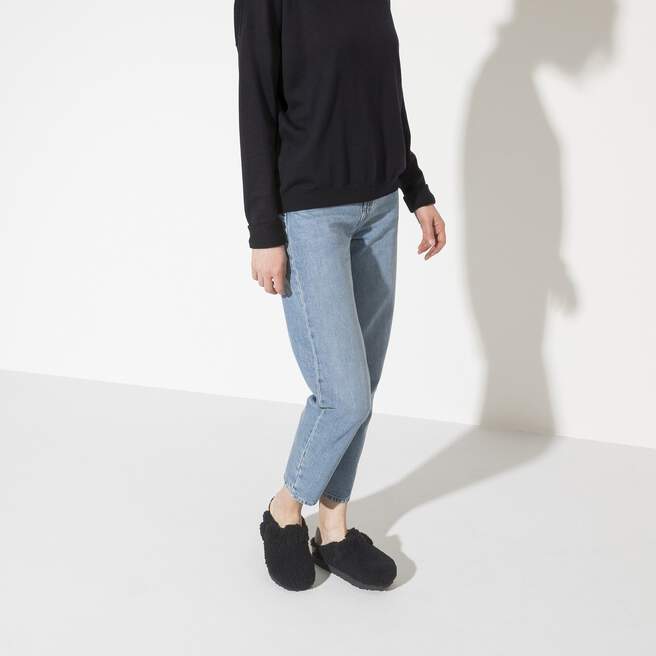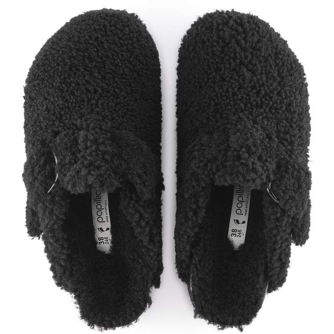 An evolution in the classic Boston clog. Here, Papillio presents the clog with a trendy platform sole. The bevel results in maximum walking comfort. This version features warm, genuine shearling padding in a Teddy style and a big, elegant pin buckle to round off this bold, but super cozy look. The upper is made from Teddy style genuine shearling with a microfiber lining.