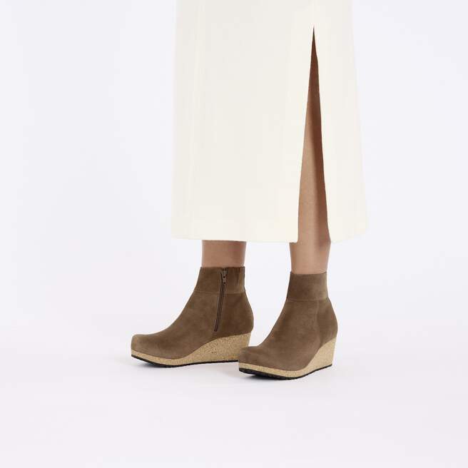 The Ebba ankle boot brings the contoured comforts of the BIRKENSTOCK footbed together with a cork wedge heel¡ªall without adding pressure to the front of your foot. In smooth suede for a classic feel. Level up your style in comfort.