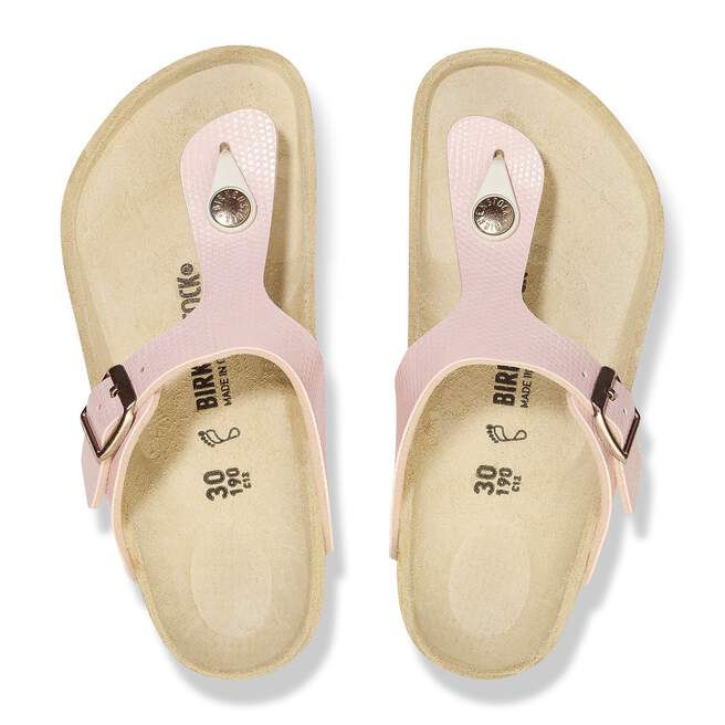 The BIRKENSTOCK Gizeh is a genuine classic that combines optimum grip with fashionable design to really turn heads at school. This version comes in a shiny lizard design and exudes elegance and a touch of extravagance thanks to the iridescent metallic foil and the reptile skin look. Inspired by nature, no two shoes have the same look and feel. The upper is made from the skin-friendly, hard-wearing synthetic material Birko-Flor?, which has been embossed.