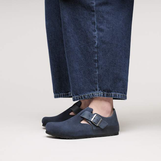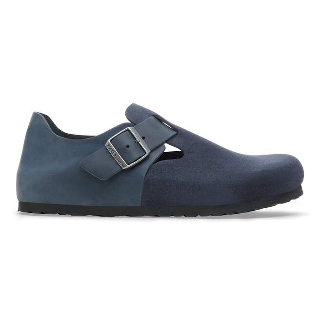 The BIRKENSTOCK London is a variation on the classic Boston. The raised heel section is characteristic of this simple low shoe with no stitching. It boasts a natural, rustic look and an open-selvage, unlined finish. The upper is made from suede in combination with oiled nubuck leather.
