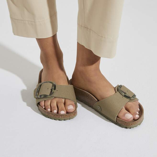 Effortlessly elegant. This season, the iconic Madrid sandal goes vegan with a 100% natural cotton canvas upper. A printed oversized buckle brings the style together with a statement finish. Complete with legendary BIRKENSTOCK design elements, like a contoured cork-latex footbed that shapes to you for custom support.