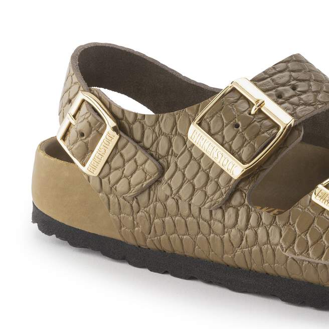 The BIRKENSTOCK Milano now features a reptile leather look and feel and a compact design with an ankle strap. The metal pin buckles are individually adjustable with color-coordinated detailing. The exquisite footbed is fully lined with soft piumato leather, making it exceptionally comfortable. The upper is made from embossed natural leather.