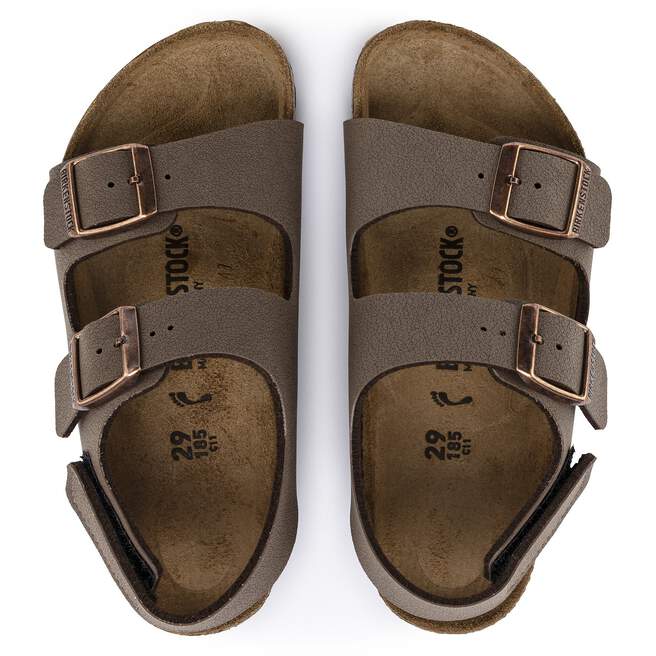 The BIRKENSTOCK Milano is perfect for kids. Featuring a backstrap with a hook and loop closure and adjustable straps for a secure fit. The upper is made from Birkibuc.
