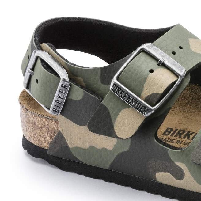 The BIRKENSTOCK Milano is perfect for kids. Featuring a backstrap for extra security. All three straps are adjustable and the upper is easy to care for, just wipe clean. The color-contrasting buckles make the classic sandal fun and playful. The upper is made from the skin-friendly, hard-wearing synthetic material Birko-Flor?.