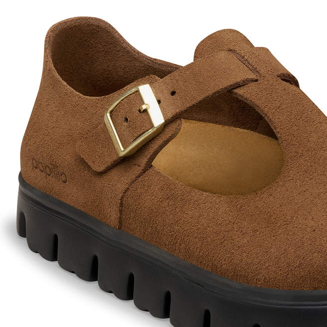 The BIRKENSTOCK Paris is a reinterpretation of the popular Mary Jane silhouette. This eye-catching shoe with a classic T-bar design combines timeless elegance with modern comfort. The striking T-strap gives the model a feminine yet modern look that is perfect for everyday wear. The buckle on the side allows the shoe to be adjusted for a perfect fit and ensures optimal support all day long. Here, Papillio presents the shoe with a stylish platform sole with extra deep tread lines. The bevels at the front and back provide for maximum walking comfort. The upper is made from especially soft suede which hugs the foot like a second skin.
