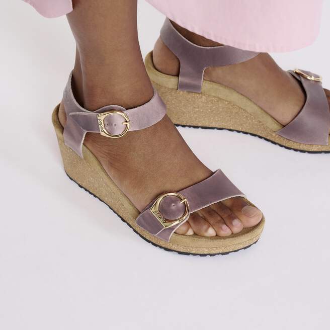 The Soley wedge heel sandal from Papillo is both stylish and comfortable. Featuring an ankle strap and elegant ring buckles for an fashionable yet incredibly comfortable shoe. The upper is made from extra thick, oiled nubuck leather.